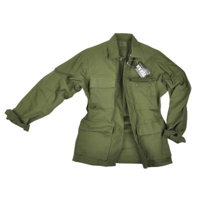 -klasyczny kołnierz, -zapinana na guziki, -cztery kieszenie zapinane na guziki, -regulacja szerokości pasa i rękawów, -wzmocnienie łokci za pomocą dodatkowej warstwy materiału,Parametry techniczne produktu Bluza BDU olive S
